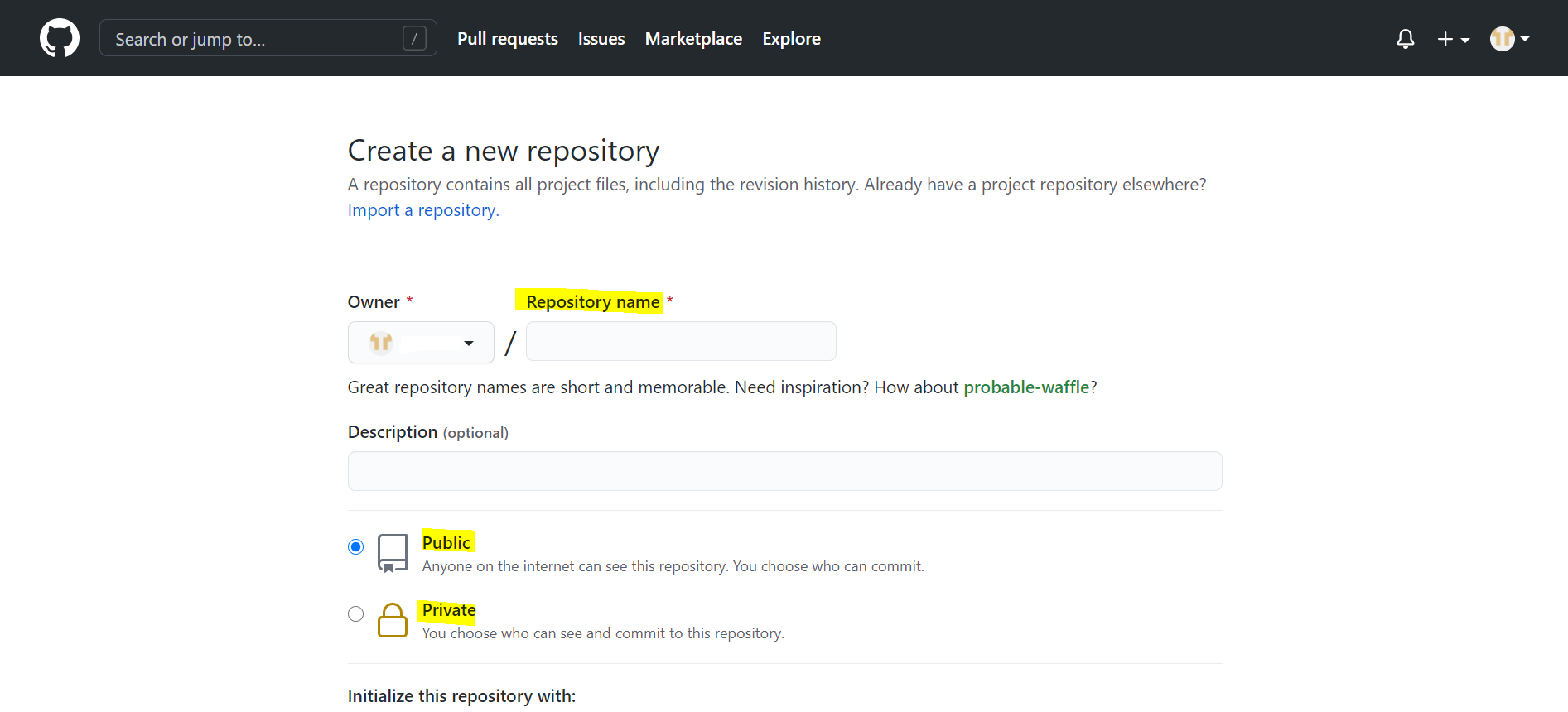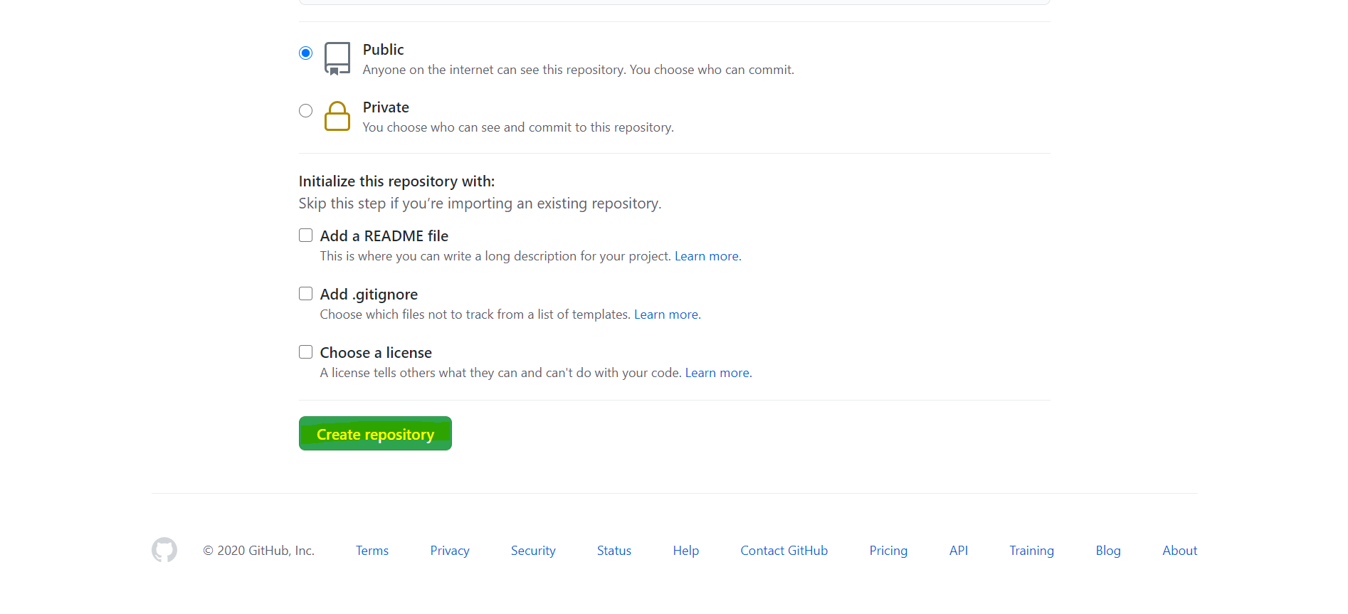 โข ๋ฆฌํฌ์งํ ๋ฆฌ ์ด๋ฆ ์ ๋ ฅ - 'Public(์ ์ฒด๊ณต๊ฐ)/Private(๋น๊ณต๊ฐ)' ์ ํ - 'Create repository' ํด๋ฆญ