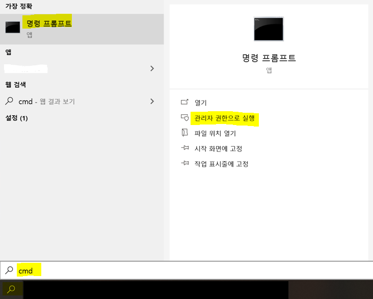 โ ์์ - ๊ฒ์ - '๋ช ๋ น ํ๋กฌํํธ(cmd)' ๊ฒ์ - '๊ด๋ฆฌ์ ๊ถํ์ผ๋ก ์คํ' ํด๋ฆญ