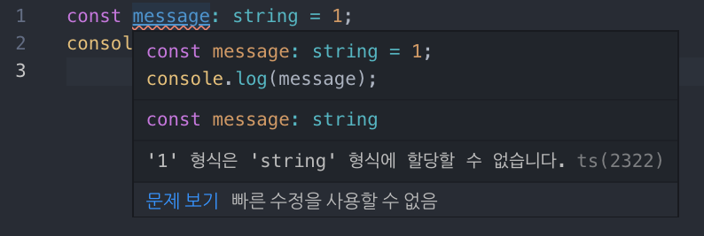 const message: string = 'hello world'; // ๋ฌธ์์ด